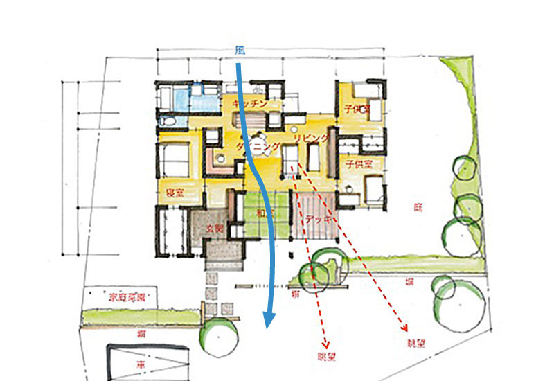 私たちは、土地が持つ記憶や個性を読み解くことから始めます。山鹿の美しい山並み、季節で変わる風の通り道、隣地の緑。それらを計算し尽くした窓の配置や軒(のき)の深さが、室内と外の境界を心地よく曖昧にします。「リビングに座っているだけで、移ろいゆく季節を特等席で眺められる」。そんな贅沢を、高い設計力が実現します。