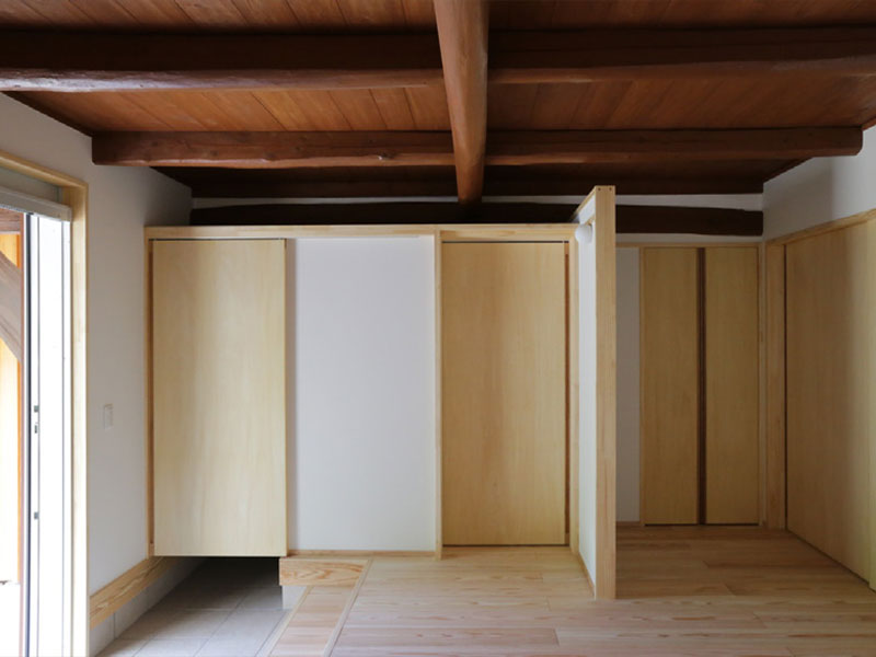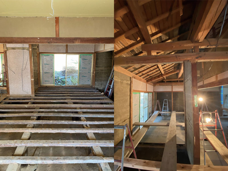 天井・壁・床に断熱材を施工。窓はペアガラスのサッシと交換しました。希望されていた漆喰の補修は下地の状況を鑑みて板壁に変更しました。